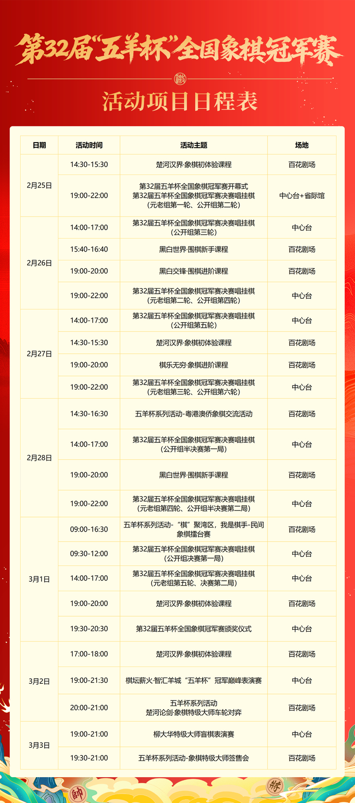 3月2日,在新春元宵节来临之际,公开组和元老组冠军将在广州文化公园中心台上演压轴的巅峰对决“表演赛”,为棋迷和游客倍添节日氛围。